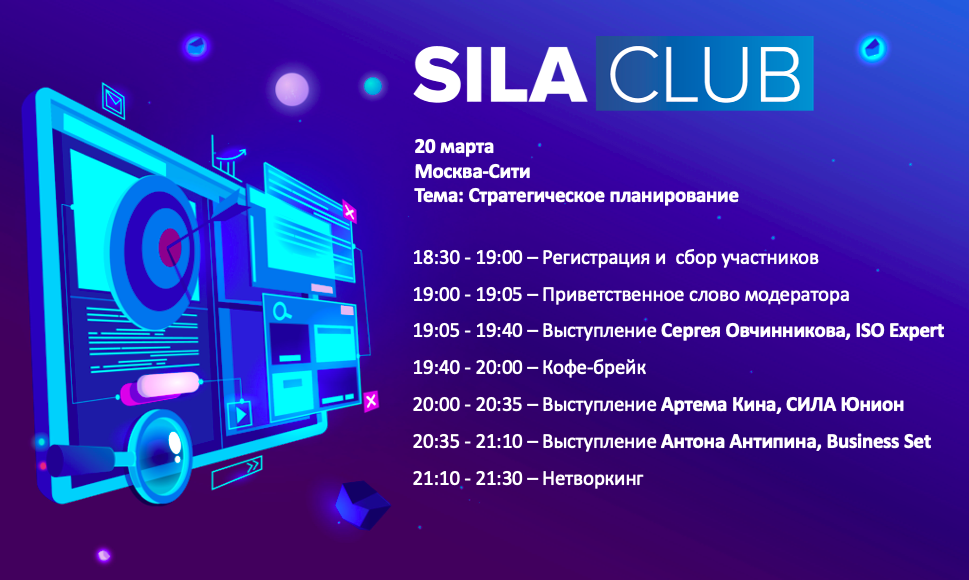 Коллеги, рады поделиться с вами программой предстоящей встречи сообщества SILA CLUB 20 марта. Тема встречи - Стратегическое планирование.