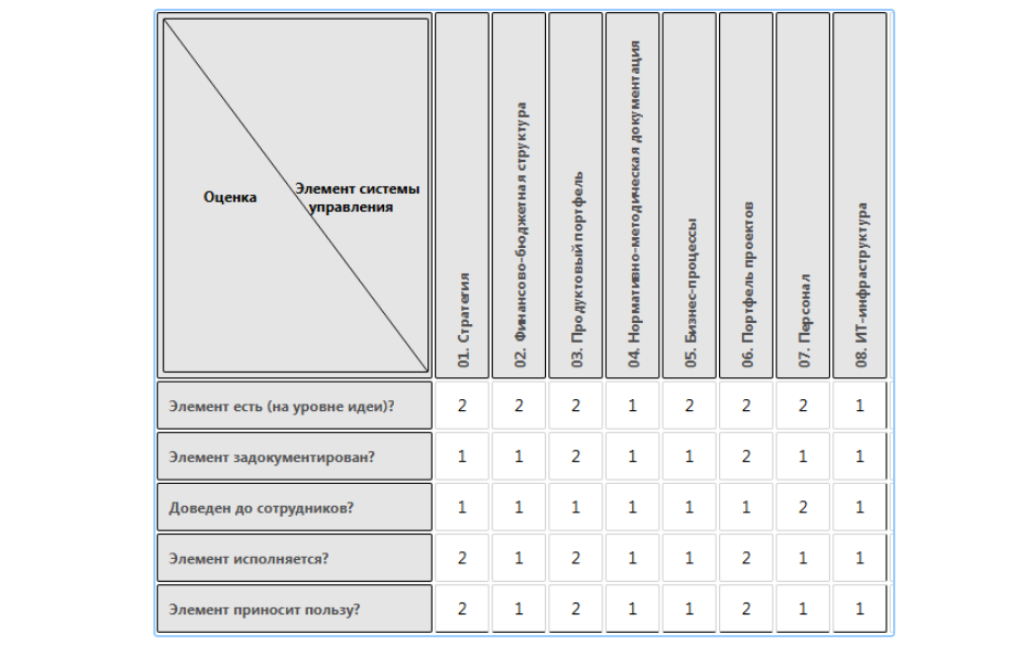 Здесь я их только перечислю: стратегия, финансово-бюджетная структура, продуктовый портфель, нормативно-методическая документация, бизнес-процессы, портфель-проектов, персонал и IT-инфраструктура.
