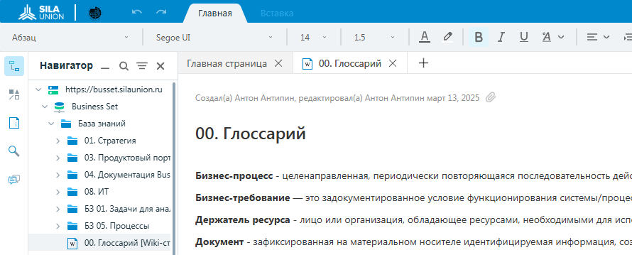 Инструмент номер один - это бесподобные вики-страницы. Вики-страницы - невероятное конкурентное преимущество SILA Union перед другими аналогичными инструментальными средствами. Вики-страницы исполнены и организованы в системе очень качественно. Используя их, вы можете создавать любые документы, целые разделы и корпуса документации, в том числе и глоссарий компании. Работать с вики-страницей можно и в распределенном режиме! То есть некоторое количество экспертов может одновременно работать с одним и тем же документом.