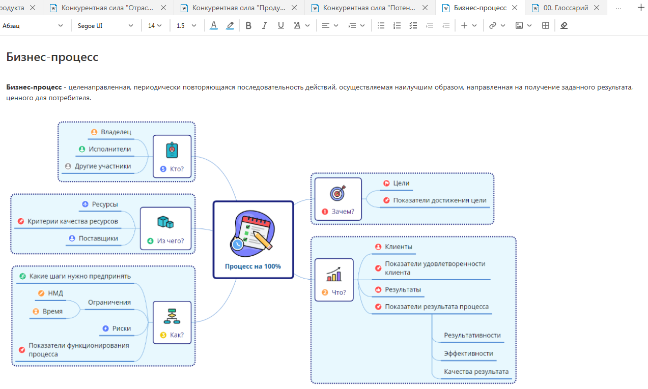 Больше никаких путаниц в терминах! Создавайте детальные статьи с определениями, примерами, изображениями и даже видео. Каждый термин можно привязать к бизнес-процессам — и сотрудники смогут мгновенно получить справку прямо из регламентов.